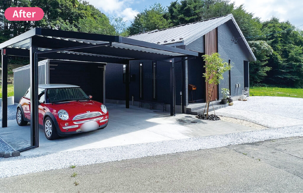 お施主と膝を交えて入念に打ち合わせ、敷地の形状を考慮してカーポートの後方へガレージを設置し、ストレスなくガレージへ入れられる空間デザインを提案しました。アプローチ部分にはインターロッキングを採用。コンクリートブロックを互いにかみ合わせるように敷き詰め、隙間に砂を充填(じゅうてん)して舗装しました。