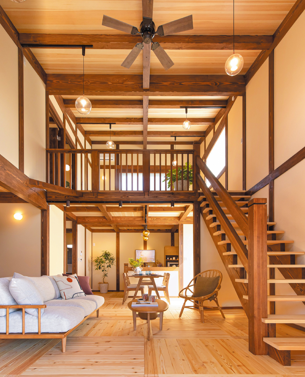 どこか懐かしさを感じさせながら、洗練されたデザインで心地よさを演出。梁と柱の美しさを生かした空間が、暮らす人に安らぎをもたらしてくれる。