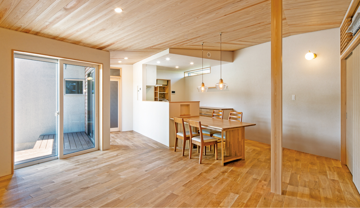国道沿いという条件ながら平穏な暮らしをかなえた。この木造約100㎡のA邸は、敷地を最大限に生かした配置計画が特筆すべき個性。無機質な四角形の定型を覆し、騒音から遠ざける創意工夫を施した、環境に呼応した空間デザインが際立つ。断熱性能は現行基準で最高等級の7を取得し、UA値は0.23を達成。季節を問わないG3グレードの快適さは、冷暖房費の大きな削減にもつながる。創業から20年にわたり施主のこだわりに寄り添ってきた同社は今年、建設業に登録。設計・施工・管理の一社請負が可能になった。