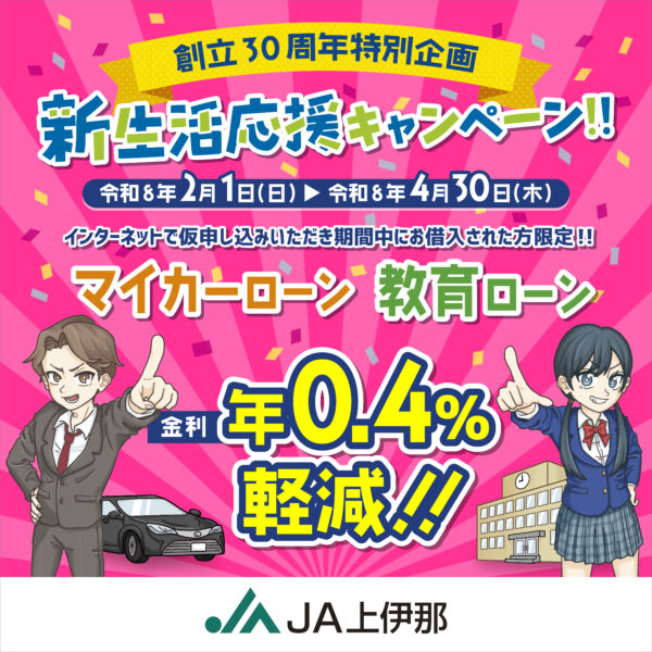 創立30周年特別企画 新生活応援キャンペーン!!〈マイカーローン・教育ローン〉【JA上伊那ローンセンター】