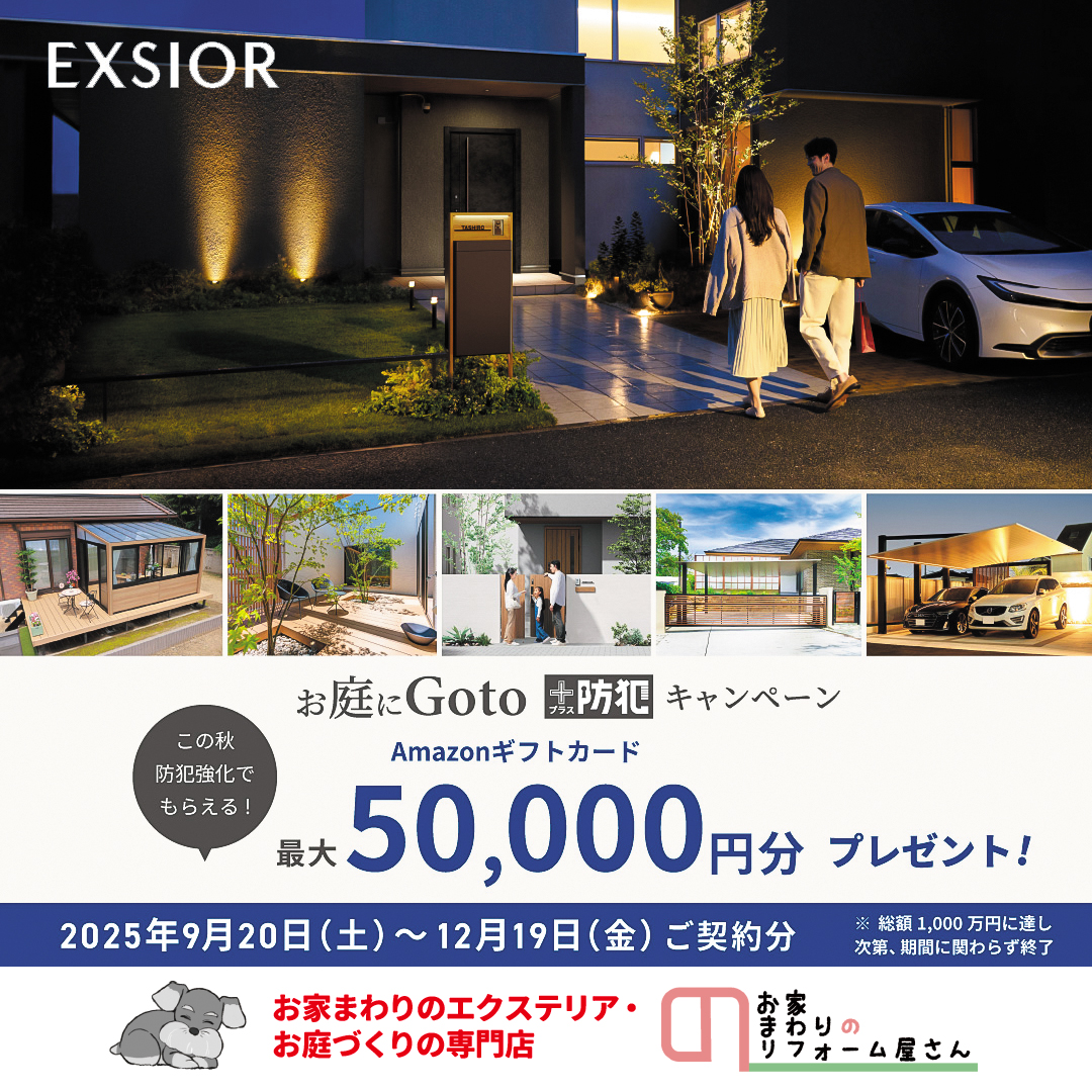 イベント名 | 「お庭にGoto + 防犯キャンペーン」 ガーデンルーム・ウッドデッキ・カーポートの施工をお考えの方にお得なチャンス! |
