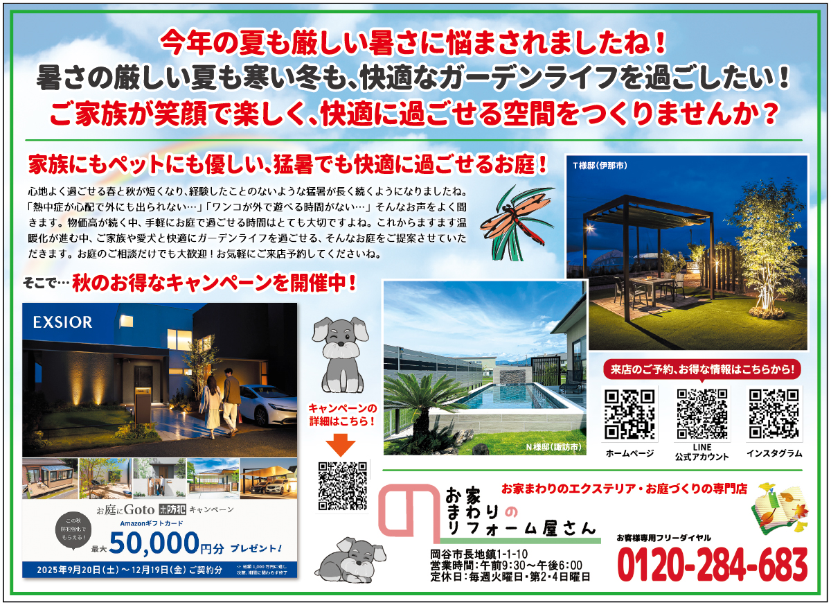 おうちまわりのリフォーム屋さん 長野県の岡谷・諏訪・茅野・上伊那地区のお客様を中心に、外構・エクステリア工事・ガーデニング工事を、デザインから設計、施工までトータルでご相談いただけるお庭づくりの専門店です。ご家族の皆様が笑顔で楽しく「お庭をきれいにしてよかった!」と言っていただけるように、スタッフ一同全力でサポートさせていただきます。