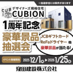 デザイナーズ規格住宅 CUBIONモデルハウスOPEN 1周年記念豪華景品抽選会【窪田建設】 2025年12月1日 00:00 – 2026年1月25日 23:55 会場: CUBION展示場 カテゴリ: キャンペーン, 期間限定, 駒ヶ根市